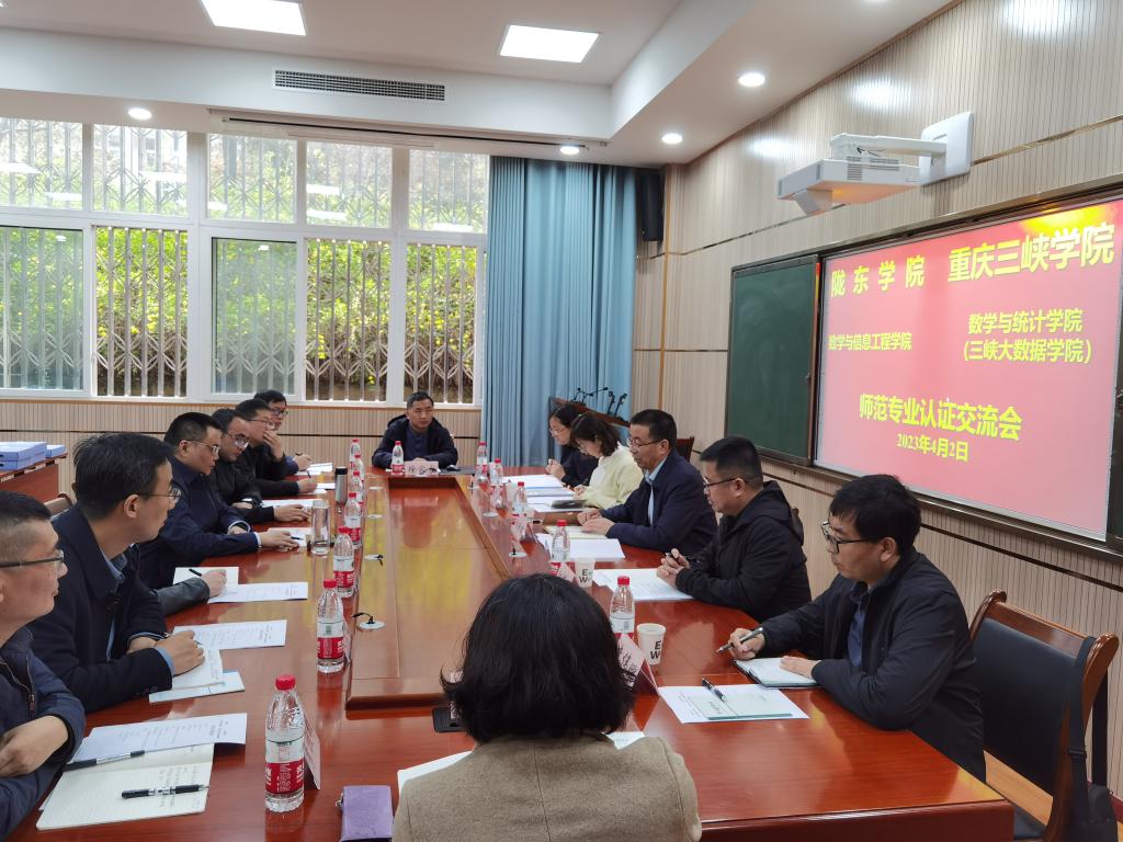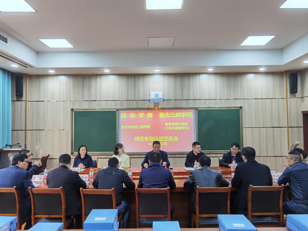 应陇东学院数学与信息工程学院商请,4月2日上午在学院104会议室召开了师范专业认证工作交流会,陇东学院数学与信息工程院长闫彦宗、副院长郭芳承、数学系系主任齐渊、信息与计算科学系主任李伟鹏、教师李红霞,我院院长熊江、副院长赵永祥、副院长涂正文、数学与应用数学系主任陈彦恒、信息与计算科学系主任刘金魁、统计学系主任左占飞、大数据管理与应用系主任李祖雄、实验室主任徐家良、教务管理办公室主任吴荣出席会议,学院副院长赵永祥主持交流会。