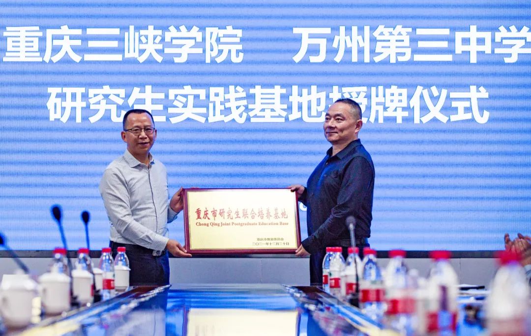 郭作飞代表重庆三峡学院授予万州三中“重庆三峡学院——万州第三中学研究生实践基地”牌匾。