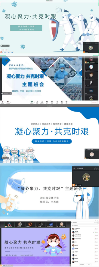 为贯彻落实全市高校疫情防控工作视频会、全市高校安全稳定工作视频会精神,引导同学们正确看待疫情防控形势,珍惜来之不易的疫情防控成果,坚定抗疫必胜信心,2022年11月28日,我院各年级组织召开了“凝心聚力,共克时艰”线上主题班会。