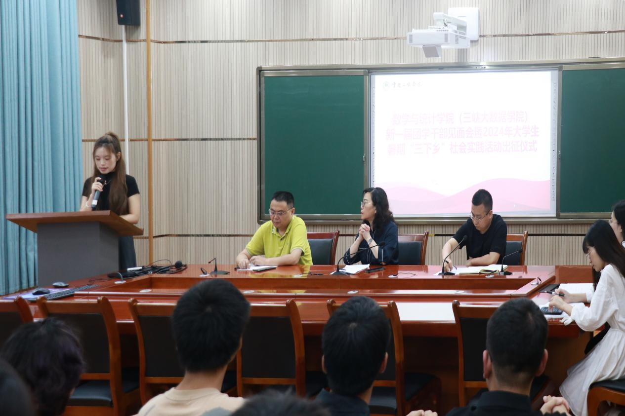 为深入学习贯彻习近平新时代中国特色社会主义思想和党的二十大精神,学习宣传贯彻习近平文化思想、习近平总书记五四青年节对全国广大青年寄语精神,引导和帮助青年学生在社会课堂中受教育、长才干、作贡献,争做有理想、敢担当、能吃苦、肯奋斗的新时代好青年。7月5日下午,9728太阳集团(三峡大数据学院)在明辨楼1栋104会议室召开新一届团学干部见面会暨2024年大学生暑期“三下乡”社会实践活动出征仪式。学院党总支书记黄明靖、院长熊江、各年级辅导员、新一届团学干部及2024年大学生暑期“三下乡”社会实践团成员参会,会议由团总支副书记韩素斌主持。