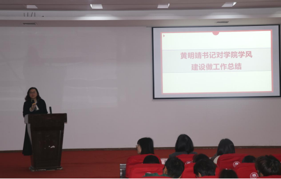 最后,黄靖明书记对本学年度学院学风建设工作做总结,并对下一年的创建工作提要求。黄书记总结了一年来学院学风建设取得的成效和存在的问题,从激发内生动力、涵养优良学风;加强朋辈引领、发挥榜样示范;强化精细管理、促进优良学风;加强惩戒震慑、助力学风建设几个方面对学院后期学风建设提出明确工作要求。黄书记强调学风建设直接影响教学质量和人才培养质量,学生是学风建设的主体,同学们要增强主人翁意识,用高标准严要求自己,为成为班风正、学风浓、学业优的先进示范班集体贡献自己的力量。