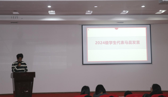 2024级马晨同学代表全体新生表达了对大学生活未来的期待与展望,表示将以“优良学风班”创建为契机,培养自律能力和自主学习意识,养成良好学习习惯,不断提升学习效率和专业素养,努力成长成才,做能担重任的新时代青年。