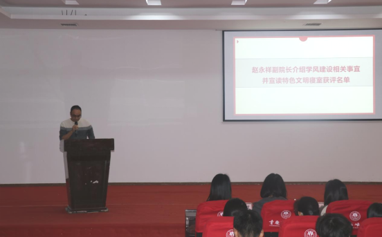 首先,赵永祥副院长发言,他介绍了学风建设相关事宜,赵院长强调,学风是学生成长成才的关键,是学院教育质量的保障,是学院学术发展的基础。优良学风有助于塑造学生的价值观,提升学生的个人品质;优良学风能促进教学相长,形成良性循环;优良学风能促进学术诚信和学术创新,推动学科内涵发展。