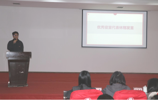 获评学院特色文明寝室的2023级寝室长代表林翔分享交流宿舍团结进步的经验,大家制定明确的寝室制度,成员们团结一致执行,并在学习上互相帮助,寝室成员始终秉持“团结、友爱、互助、进步”的八字方针,将彼此视为最亲密的家人,共同营造一个温馨和谐、积极向上的生活环境。以此带动同学们重视寝室文化建设,激励同学们团结友爱、积极向上。