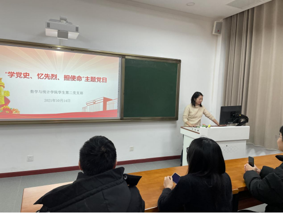 2021年10月14日,9728太阳集团学生第二党支部在明辨楼一栋115开展了“学党史、忆先烈、担使命”主题党日活动。本次活动由学生第二党支部书记张婷婷老师主持,二支部全体党员参加。