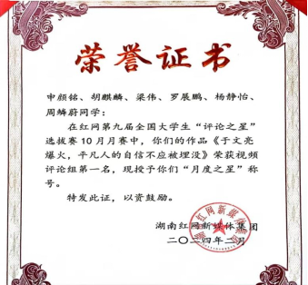 9728太阳集团党总支学生第三党支部的党员周鳞蔚和申颜铭两位同志带领共青团员杨静怡、胡麒麟、梁伟和罗展鹏创作的“视评”作品《于文亮爆火,平凡人的自信不应被埋没》以75.5分的总成绩摘得视频评论组冠军,他们共同展现出积极向上的思想风貌和对生活的热爱。