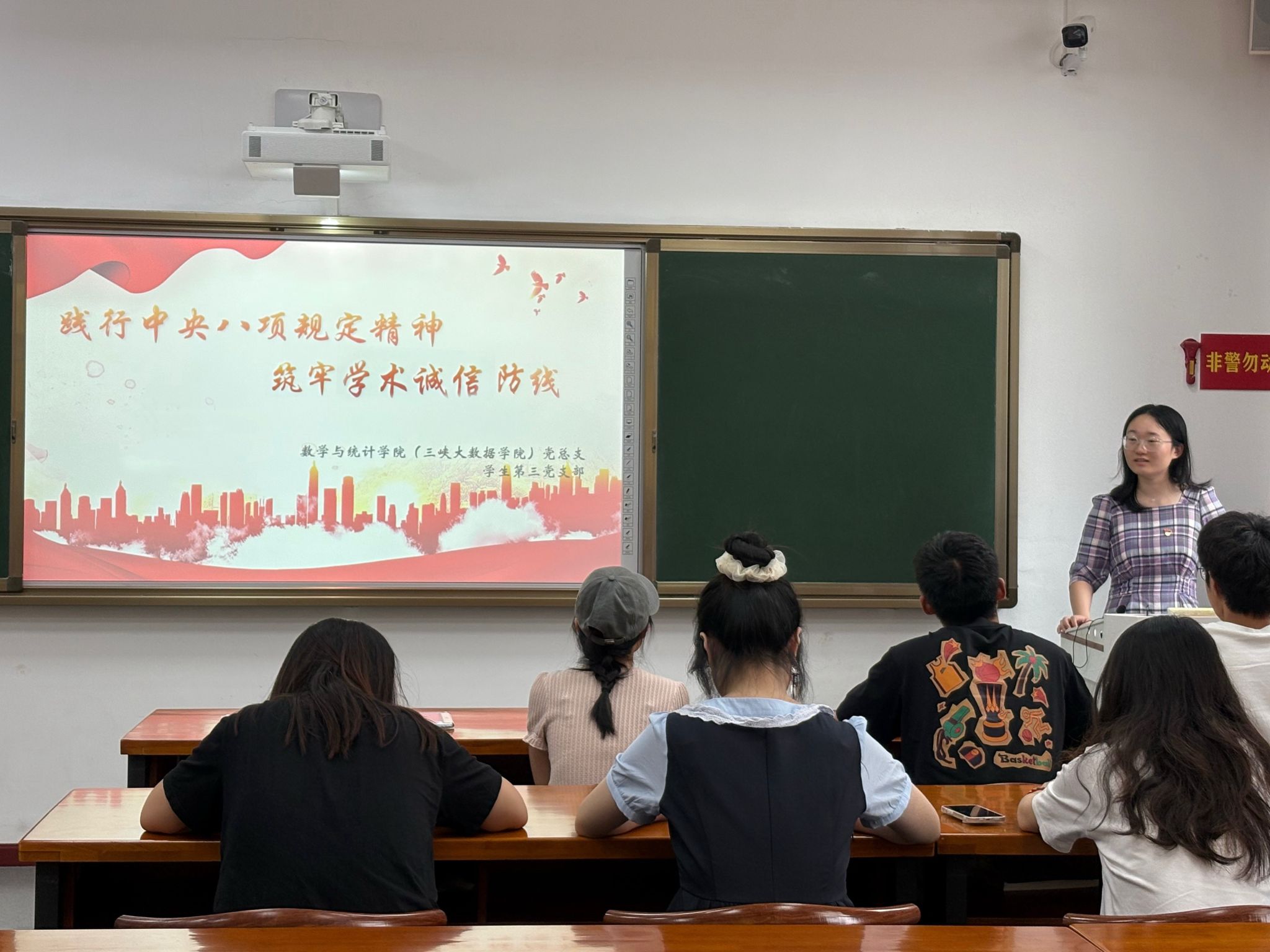 6 月 25 日,学生第三党支部书记王岚在明辨楼 1-115 教室讲授 "践行中央八项规定精神,筑牢学术诚信防线" 专题党课。