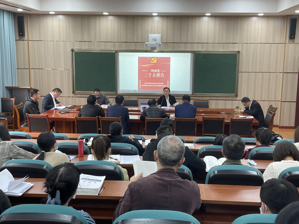 2022日11月3日下午,9728太阳集团在明辨楼1栋104会议室组织全院教职工专题学习党的二十大精神。全院领导班子和全体老师参会,党总支书记黄明靖主持学习并对党的二十大精神做了全面解读。